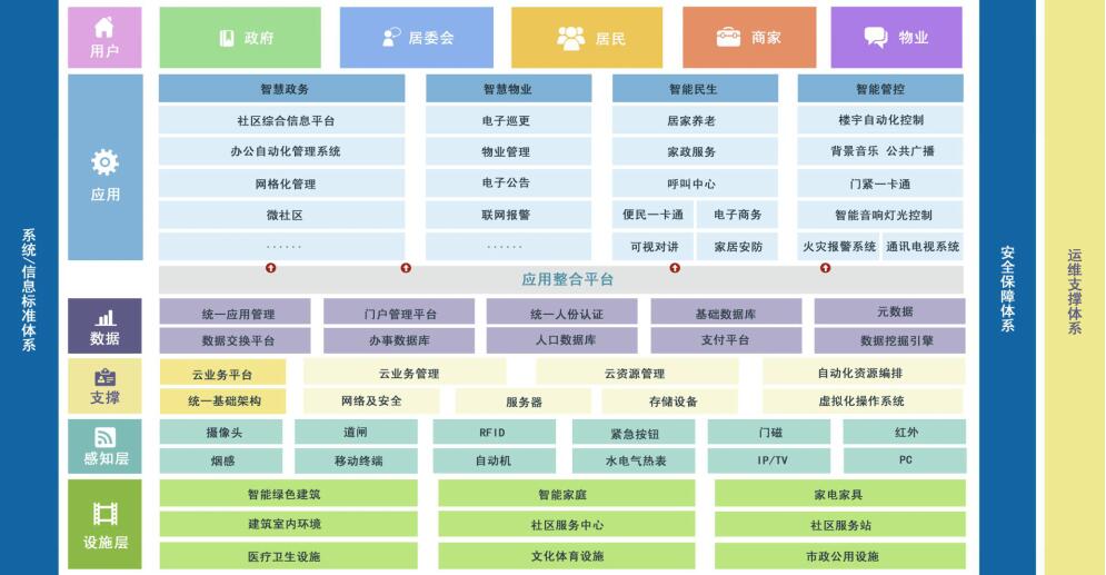 智慧社區(qū)項目從業(yè)務(wù)需求及基本現(xiàn)狀來講,都要考慮實際的應(yīng)用和未來發(fā)展,既能滿足目前業(yè)務(wù)需要,又能適應(yīng)未來技術(shù)的發(fā)展的需求。因此,在項目的頂層設(shè)計中,除了保證系統(tǒng)建設(shè)的安全性、實用性、拓展性等,還要遵循集中管控、分散管理的建設(shè)原則,堅守智慧社區(qū)的建設(shè)特色。所謂的集中管控是指:項目遵循“一體化”的原則進(jìn)行設(shè)計,采用一個統(tǒng)一的數(shù)據(jù)平臺、統(tǒng)一的管理使用平臺、統(tǒng)一的終端基礎(chǔ)軟硬件平臺、統(tǒng)一的卡片規(guī)劃平臺,這樣街道辦事處在總體項目上投資小、售后服務(wù)成本低、升級容易、管理簡單。更為重要的是一體化的架構(gòu)使得系統(tǒng)平臺結(jié)構(gòu)關(guān)系變?yōu)楹唵?,各個應(yīng)用子系統(tǒng)可以在同一個平臺上進(jìn)行操作,降低了應(yīng)用系統(tǒng)的擴(kuò)展和實施的難度。所謂的分散管理是指:完全支持一個街道辦事處、多個社區(qū),一個服務(wù)端、多個終端,一個平臺、多個用戶的管理模式,讓管理不再受地域和空間限制。