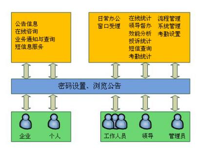 系統(tǒng)平臺提供外網(wǎng)功能,通過與因特網(wǎng)的信息交換,建立政府與企業(yè)和社會公眾之間網(wǎng)上行政審批與監(jiān)察的通道,實現(xiàn)網(wǎng)上咨詢、查詢、申請、審批、投訴、監(jiān)督等業(yè)務功能;成為真正的網(wǎng)上辦公、辦事的在線服務平臺,拉近了企業(yè)、居民與政府部門間的距離,強化政府形象。