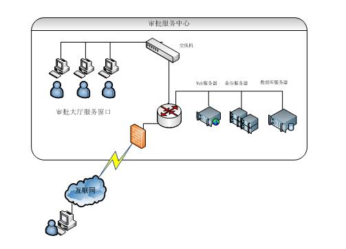 3、“審批服務中心”局域網(wǎng)與客戶通過外網(wǎng)進行互聯(lián)。