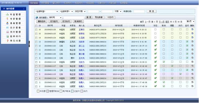 3、 預(yù)約確認(rèn)后,生成預(yù)約號,就診時,需憑預(yù)約號領(lǐng)取門診號就診。 后臺管理功能描述 1、 修改、取消患者預(yù)約信息。 2、 領(lǐng)取門診號后,需銷號。(建議在門診系統(tǒng)的操作界面中套嵌銷號界面,且留有數(shù)據(jù)接口) 3、 統(tǒng)計、查詢功能:可根據(jù)管理的需要,隨意進行各類定制的統(tǒng)計和查詢。